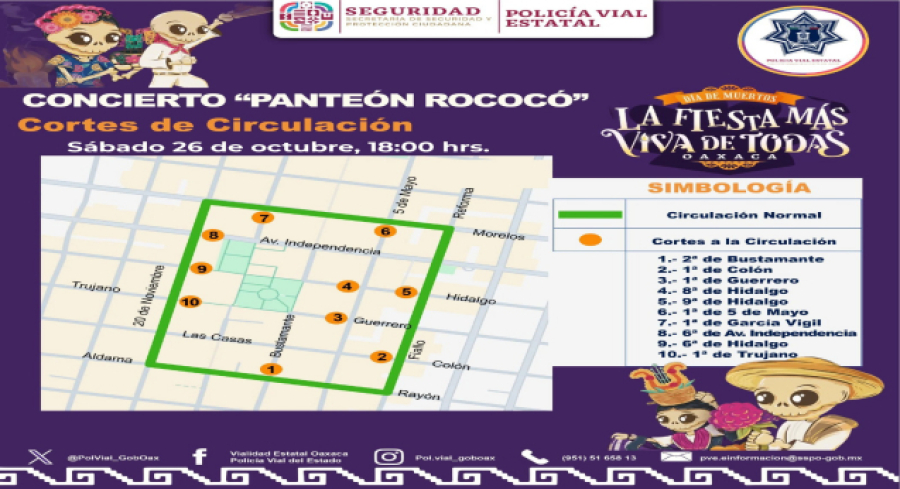 Oaxaca, México; 26 octubre 2024.- La Policía Vial del Estado informa que este sábado 26, realizará cortes a la circulación con motivo del concierto que presentará el grupo “Panteón Rococó” en la Alameda de León.