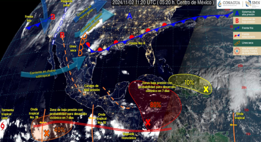La CEPCyGR agrega que un nuevo frente frío se aproxima al noroeste de México, y el Centro Nacional de Huracanes de los Estado Unidos (NHC) aumenta la probabilidad de desarrollo ciclónico en el Mar Caribe en 80 por ciento a 7 días y 40 por ciento a 48 horas, por lo que se mantiene en vigilancia por su posible evolución a un sistema mayor.