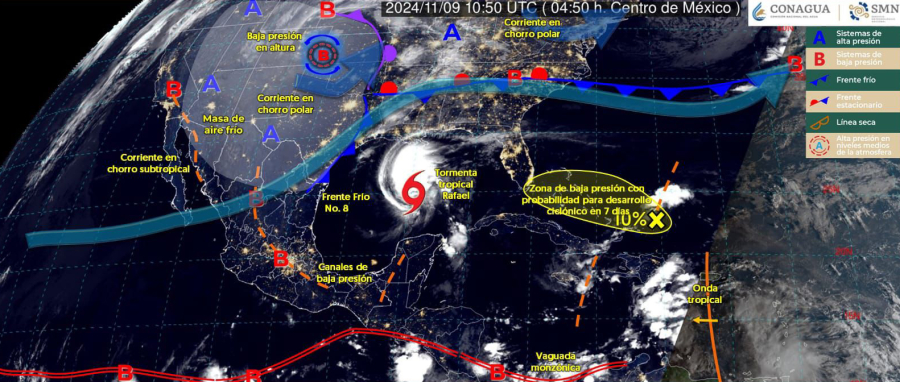 El huracán “Rafael” se ubica sobre el Golfo de México, por el momento sus bandas espirales afectan a la Península de Yucatán, un anticiclón lo está empujando hacia el oeste, con un escenario incierto en los próximos días.