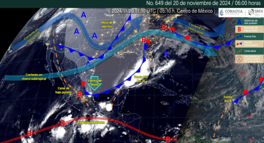 Oaxaca, México; 20 noviembre 2024.- La Coordinación Estatal de Protección Civil y Gestión de Riesgos (CEPCyGR) informa que el frente frío número 10 recorrerá el oriente y sureste del país, por lo que en su desplazamiento ocasionará lluvias de intensidad variable en la mayor parte del estado, con mayor énfasis en la parte norte del territorio oaxaqueño.
