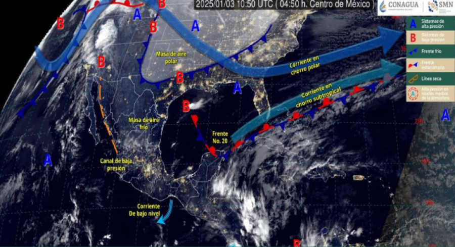 De acuerdo con el pronóstico de tiempo emitido por la Comisión Nacional del Agua (Conagua), el frente frío número 20 continuará semiestacionario sobre el centro y oriente del Golfo de México, interactuando con un canal de baja presión, lo que generará algunos chubascos y lloviznas aisladas en la zona norte del estado.