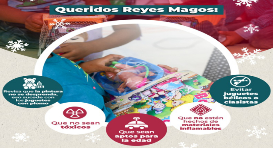 Oaxaca, México; 04 enero 2025.- Servicios de Salud de Oaxaca (SSO), a través de la Dirección de Regulación y Fomento Sanitario, hacen un llamado a los Reyes Magos y sus ayudantes a evitar adquirir juguetes de dudosa procedencia, con el propósito de salvaguardar la salud y seguridad de niñas y niños en la entidad.