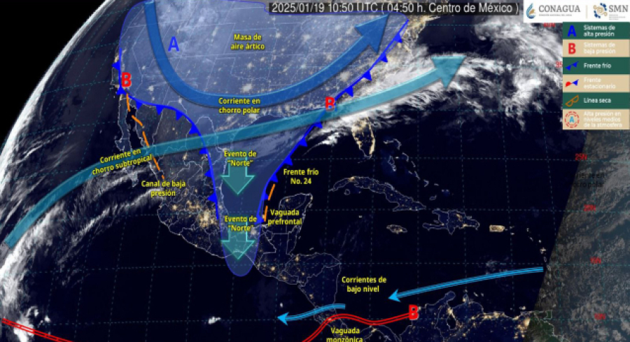 Oaxaca, México; 19 enero 2025.- La Coordinación Estatal de Protección Civil y Gestión de Riesgos (CEPCyGR) informa que, para este domingo, el frente frio número 24 recorrerá durante este día el litoral de Tamaulipas, Veracruz y por la noche alcanzará la sonda de Campeche y norte de la Península de Yucatán; aumentando la probabilidad de lluvias en la parte norte del estado, con nieblas y nubosidad baja, en serranías y mesetas altas.