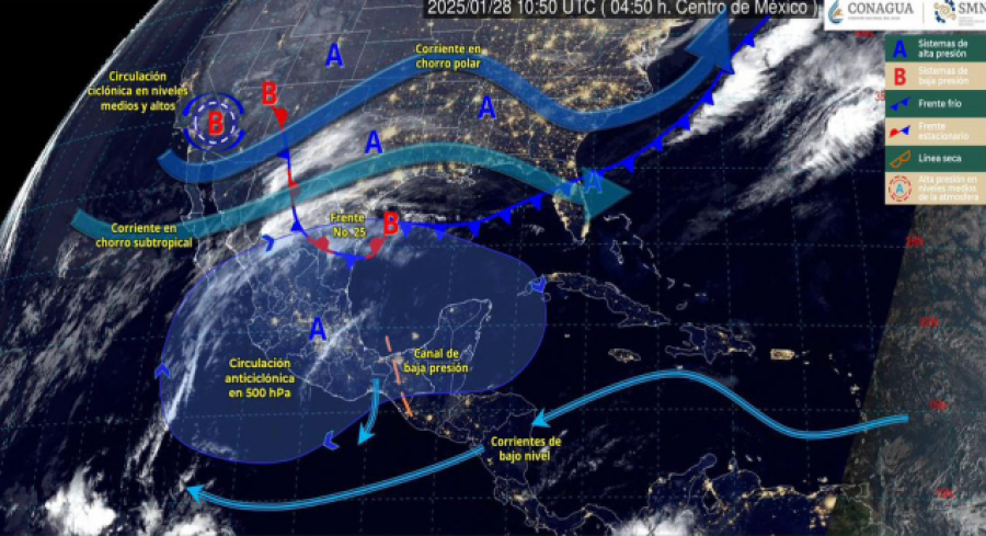De acuerdo con el pronóstico del tiempo emitido por la Comisión Nacional del Agua (Conagua), las temperaturas cambiarán poco después de haberse recuperado en las últimas 48 horas; sin embargo, la sensación de frio al amanecer y durante la noche permanecerá en zonas altas debido a escurrimientos de aire frío generado por el frente frío número 25, que se extiende sobre el centro del Golfo de México.
