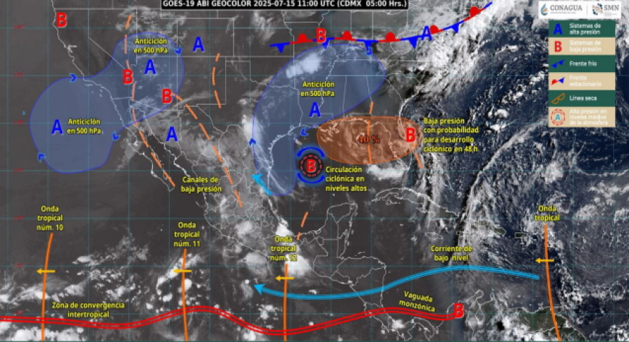 Lo anterior derivado de la onda tropical número 12 que se desplazará durante este día sobre Oaxaca, apoyada por un canal de baja presión e inestabilidad en niveles medios de la atmósfera.