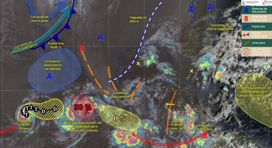 Esto se debe a la interacción de varios sistemas meteorológicos: la influencia indirecta de una zona de baja presión con alta probabilidad de desarrollo ciclónico al sur de las costas de Michoacán, Colima y Jalisco; la vaguada monzónica, y un canal de baja presión.