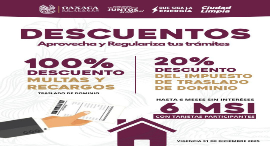 Oaxaca, México. 10 octubre 2025.- Con el propósito de fomentar la regularización de trámites y brindar facilidades a la ciudadanía, el Honorable Cabildo de Oaxaca de Juárez aprobó el estímulo fiscal denominado “No te quedes atrás, regularízate”, mediante el cual se otorgan descuentos del 20% en la suerte principal y del 100% en los accesorios del impuesto sobre la traslación de dominio a personas físicas, morales o unidades económicas que se pongan al corriente.
