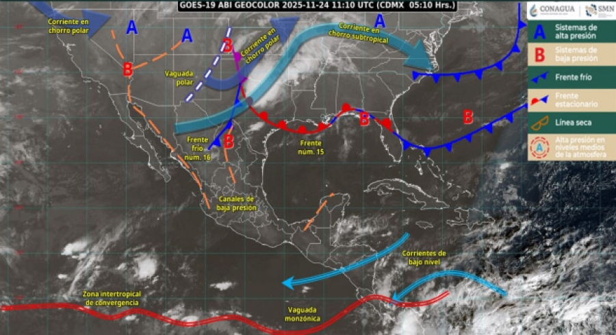 El miércoles está prevista la incursión del frente frio número 16 con mezclas invernales de lluvias, evento de norte y niveles más bajos en el termómetro.