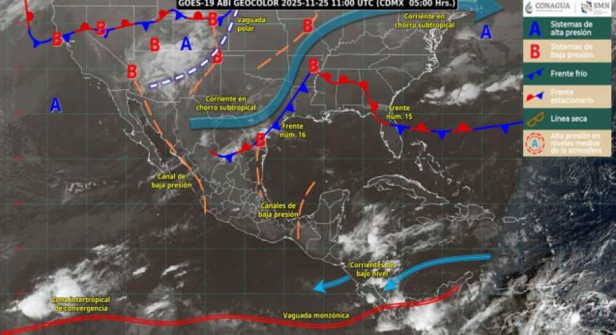Los vientos empezarán a fijarse al norte durante la tarde de este martes, con mayor intensidad el miércoles, cuando el frente frío número 16 se aproxime al Golfo de México. Se prevé que este sistema se desplace los siguientes dos días sobre el oriente del Golfo de México, el sureste del país y la Península de Yucatán, generando condiciones invernales y algunos efectos asociados a su desplazamiento.