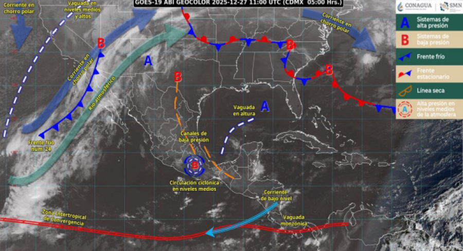 De acuerdo con el pronóstico del tiempo emitido por la Comisión Nacional del Agua (Conagua), esto es ocasionado por un canal de baja presión sobre el sureste de México, en conjunto con una circulación ciclónica en niveles altos de la atmósfera, que continuará favoreciendo la entrada de humedad proveniente del Golfo de México.