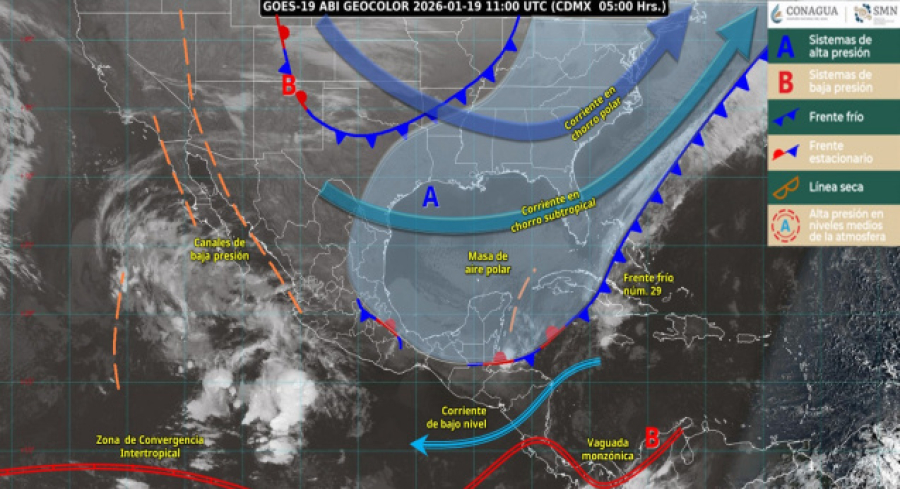De acuerdo con el pronóstico del tiempo emitido por la Comisión Nacional del Agua (Conagua), estas condiciones se derivan del frente frío número 29, el cual se extenderá sobre el mar Caribe, mientras que la masa de aire polar que lo impulsa entrará en proceso de modificación al finalizar este día.