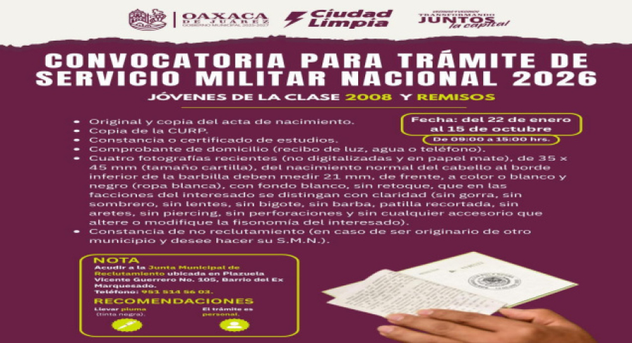Oaxaca, México. 26 de enero de 2026.- El Municipio de Oaxaca de Juárez informó la apertura de la convocatoria para el trámite del Servicio Militar Nacional (SMN) 2026, dirigida a jóvenes de la clase 2008, así como a remisos que deseen cumplir con esta obligación cívica.