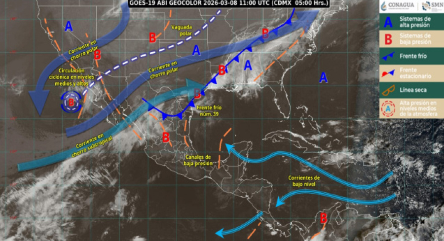 Lo anterior se debe a la presencia de un canal de baja presión sobre el sureste de México, en combinación con la entrada de humedad proveniente del océano Pacífico y el Golfo de México.