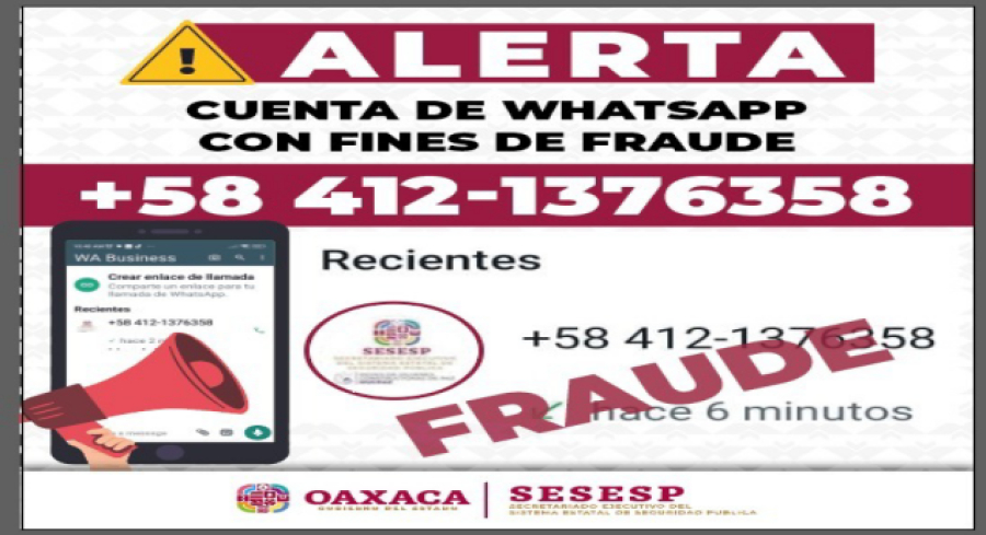 Oaxaca, México; 27 mayo 2024.- El Secretariado Ejecutivo del Sistema Estatal de Seguridad Pública (SESESP) alerta a la población sobre mensajes de texto falsos enviados vía WhatsApp en los que se solicita información confidencial a nombre de personal de la dependencia.