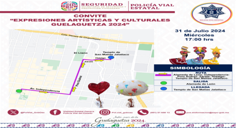 Oaxaca, México; 31 julio 2024.- La Policía Vial Estatal informa que este miércoles 31 de julio activará un dispositivo de Seguridad y Protección Vial para el convite que antecede al último evento de Expresiones Artísticas y Culturales 2024, que se desarrollará a las 17:00 horas en la capital oaxaqueña.