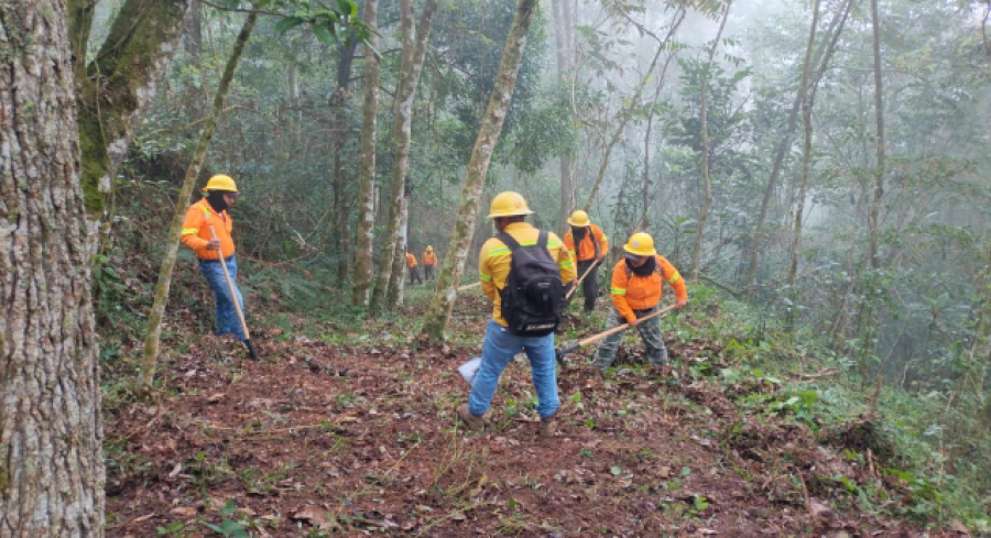 Oaxaca, México. 14 febrero 2025. Elementos de la brigada oficial de combatientes de incendios forestales de la Comisión Estatal Forestal (Coesfo), con sede en San Antonio Chimalapa, llevaron a cabo la apertura de una brecha cortafuego con longitud de 1 kilómetro en el paraje El Retén, perteneciente a San Miguel Chimalapa.
