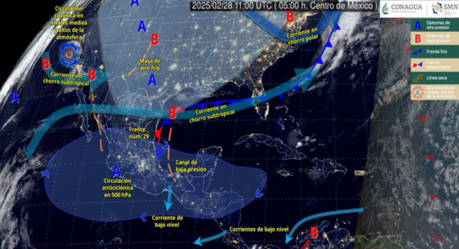 Oaxaca, México. 28 febrero 2025.- La Coordinación Estatal de Protección Civil y Gestión de Riesgos (CEPCyGR) informa que, para este viernes, el frente frío número 29 ha entrado al Golfo de México; sin embargo, debido a su debilitamiento es muy probable que no alcance a llegar al sureste de México, por lo tanto, dejará solo algunos escurrimientos de aire frío, vientos del norte moderado a fuerte y lluvias ligeras.