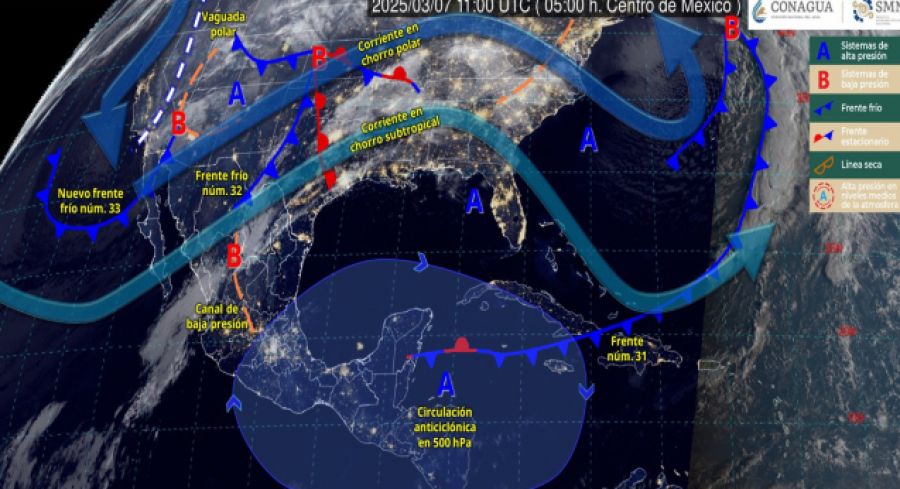 De acuerdo con el pronóstico del tiempo emitido por la Comisión Nacional del Agua (Conagua), lo anterior es derivado del establecimiento de una circulación anticiclónica en niveles medios de la troposfera. Los vientos en general soplarán del norte con intensidad moderada, acompañados de probables remolinos vespertino.