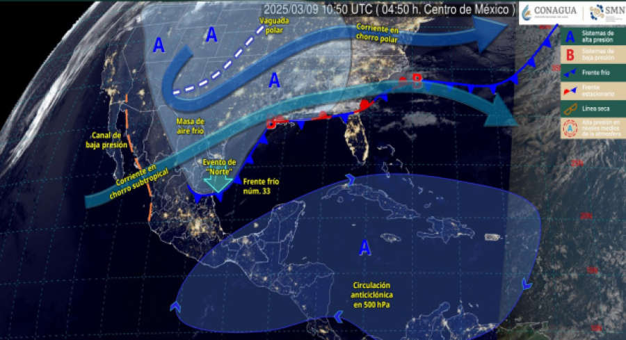 De acuerdo con el pronóstico del tiempo emitido por la Comisión Nacional del Agua (Conagua), la masa de aire frío que le da impulso ocasionará un refrescamiento térmico, evento de norte con rachas de viento fuerte de 80 a 100 kilometros por hora en el oriente del Istmo, además de áreas de niebla densa en zonas montañosas.
