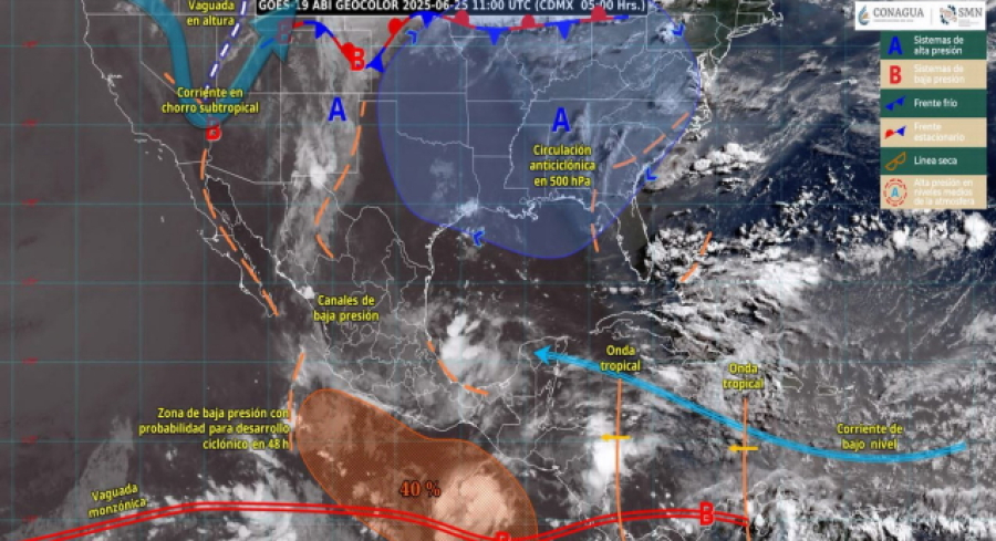 Oaxaca, México. 24 junio 2025.- La Coordinación Estatal de Protección Civil y Gestión de Riesgos (CEPCyGR) informa que, para este miércoles una zona de baja presión con probabilidad de desarrollo ciclónica al sur de las costas de Guatemala y México en interacción con la vaguada monzónica, mantendrá el temporal lluvioso en gran parte del estado.