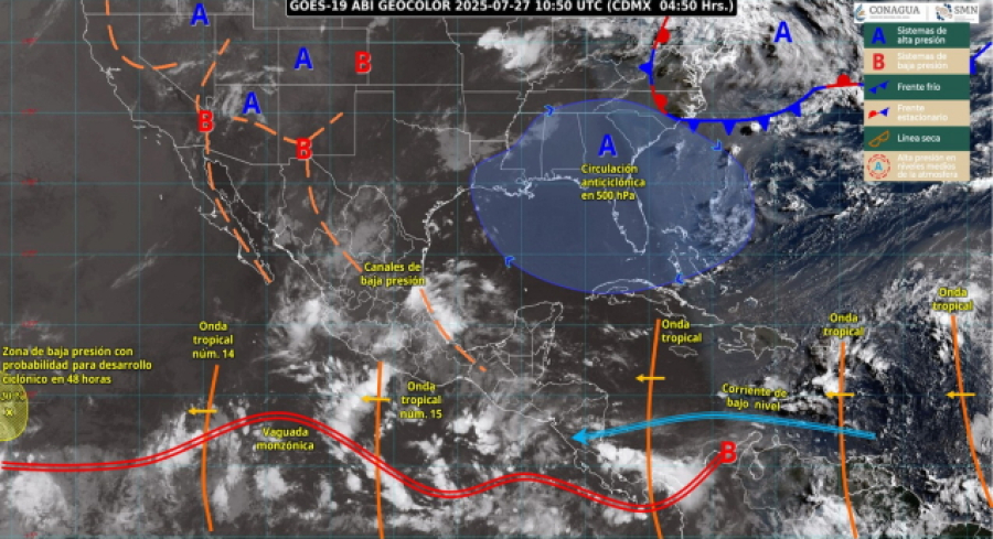 Lo anterior debido a la onda tropical número 15, que estará de salida por el occidente del estado, dejando ligera inestabilidad que se sumará a la humedad proveniente del Océano Pacífico y al acercamiento de la onda tropical número 16 que este domingo se desplazará al sur de la península de Yucatán.