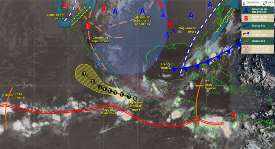 Estos efectos son ocasionados por la amplia circulación de la depresión tropical Trece-E que se desplaza frente a las costas de Guerrero y Michoacán, además de la proximidad de la vaguada monzónica.