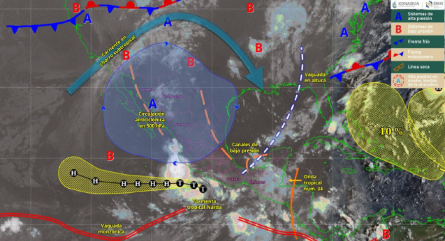 Estos sistemas se derivan del paso de la tormenta tropical Narda y sus amplias bandas nubosas combinadas con la vaguada monzónica.
