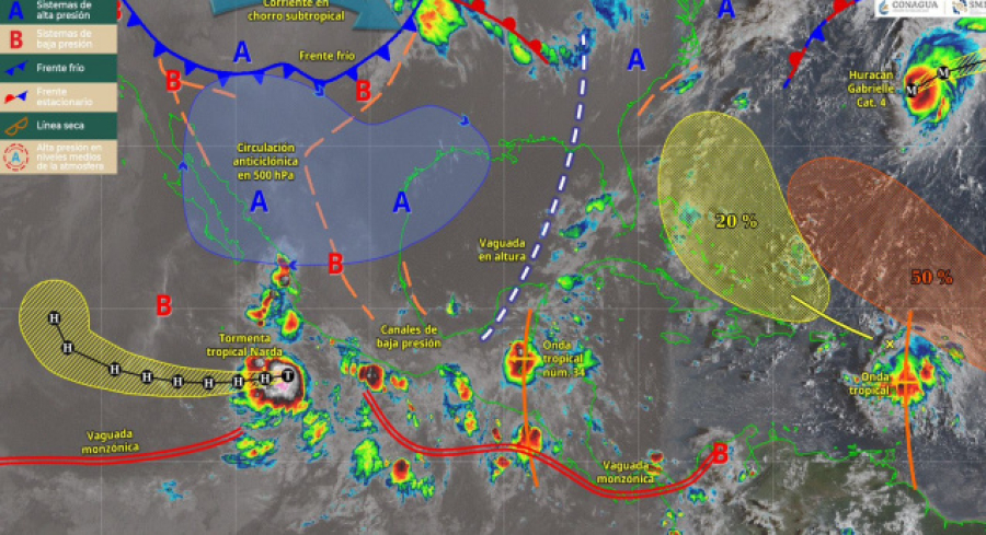 Todo esto derivado de la onda tropical número 34 sobre el sureste de México en combinación con una baja superior y la vaguada monzónica.
