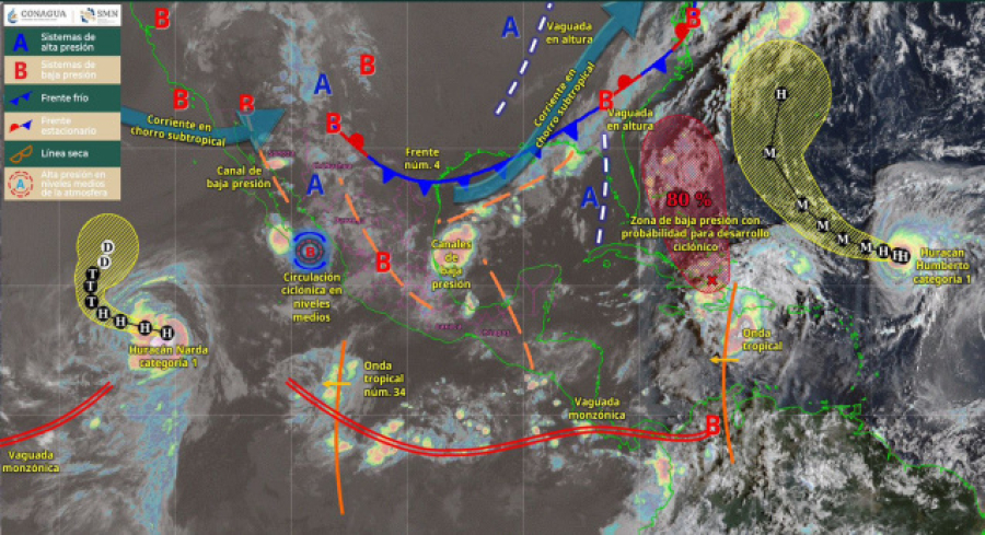 Todas estas condiciones son ocasionadas por la vaguada monzónica, un canal de baja presión y el frente frío número 4.