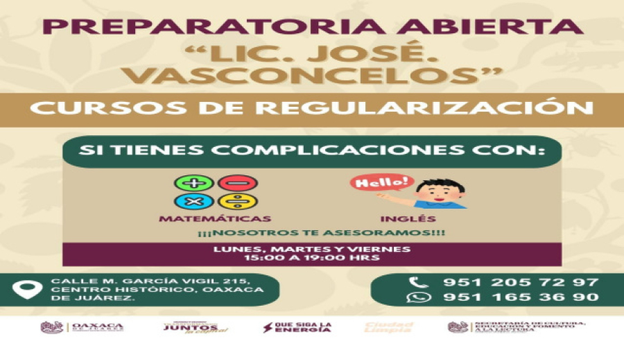 Oaxaca, México. 26 septiembre 2025.- El Municipio de Oaxaca de Juárez, a través de la Secretaría de Cultura, Educación y Fomento a la Lectura, informa que se encuentran abiertas las inscripciones todo el año en la Preparatoria Abierta “José Vasconcelos”, ubicada en el Centro Histórico de la capital.