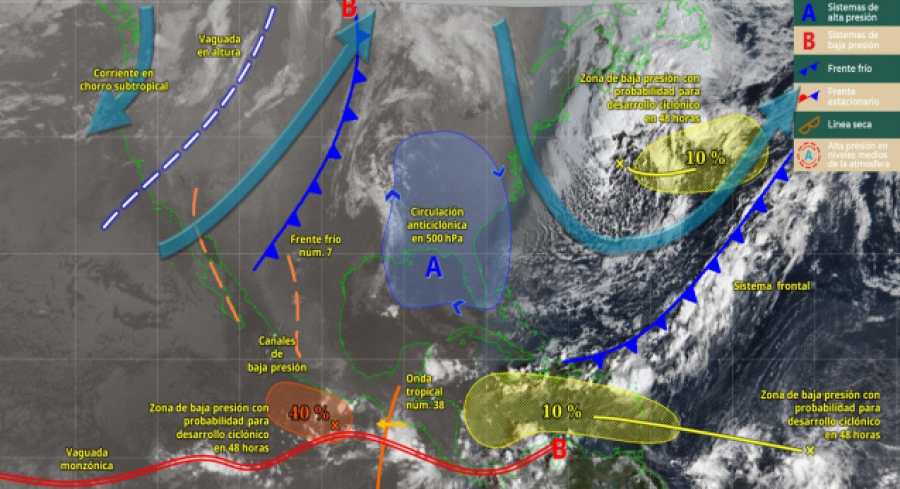 De acuerdo con el pronóstico del tiempo emitido por la Comisión Nacional del Agua (Conagua), estas condiciones son derivadas de una zona de baja presión con potencial para desarrollo ciclónico, ubicada al sur de Oaxaca y Guerrero, asociada a la vaguada monzónica.