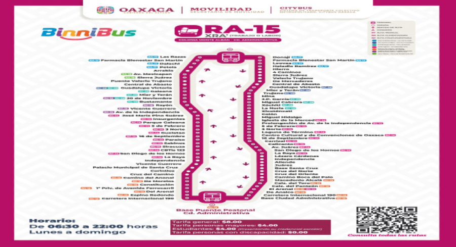 Oaxaca, México.27 noviembre 2025.- El Sistema de Transporte Colectivo Metropolitano BinniBus Oaxaca inició la operación de la ruta RA-15 “Xra” que significa Trabajo o Labor en Chocholteco, la cual conecta a la Colonia Monte Albán con Ciudad Administrativa.