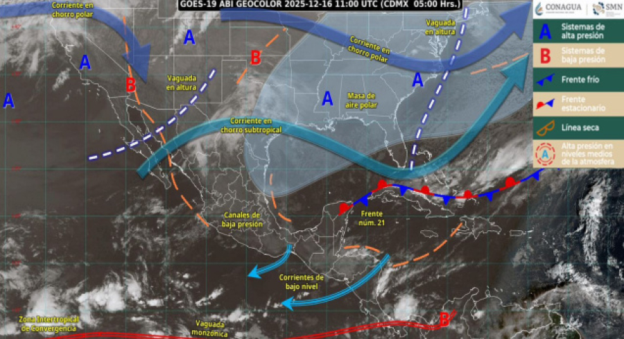 De acuerdo con el pronóstico del tiempo emitido por la Comisión Nacional del Agua (Conagua), estas condiciones se derivan de que el frente frío número 21 permanece casi estacionario sobre el Golfo de México, en interacción con un canal de baja presión establecido sobre el sureste de la República Mexicana.