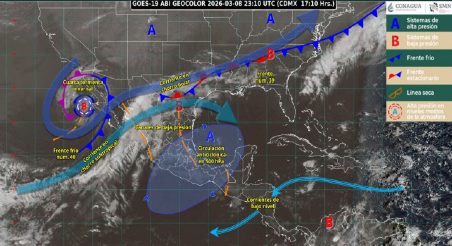 Esto se debe a la presencia de un canal de baja presión localizado sobre el sureste del país, en combinación con la entrada de humedad proveniente del océano Pacífico y Golfo de México.