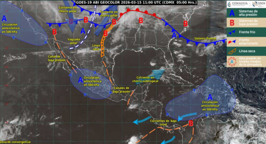 Lo anterior se debe a la presencia de un canal de baja presión ubicado sobre el sureste de México, en combinación con la afluencia de humedad proveniente del océano Pacífico.