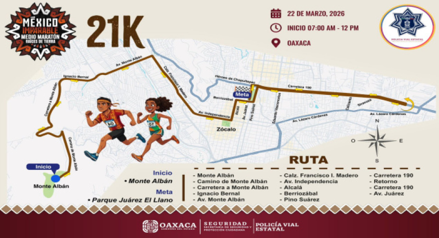 La Policía Vial Estatal resguardará a las y los corredores en la ruta Monte Albán-Gómez Morín-Tecnológico; mientras que vialidad municipal tendrá a su cargo el tramo Riberas del Atoyac-Calzada Madero-avenida Independencia-Alcalá-Humboldt-Dr. Liceaga-Pino Suárez-carretera 190 hasta la calle Brasil en la colonia América.