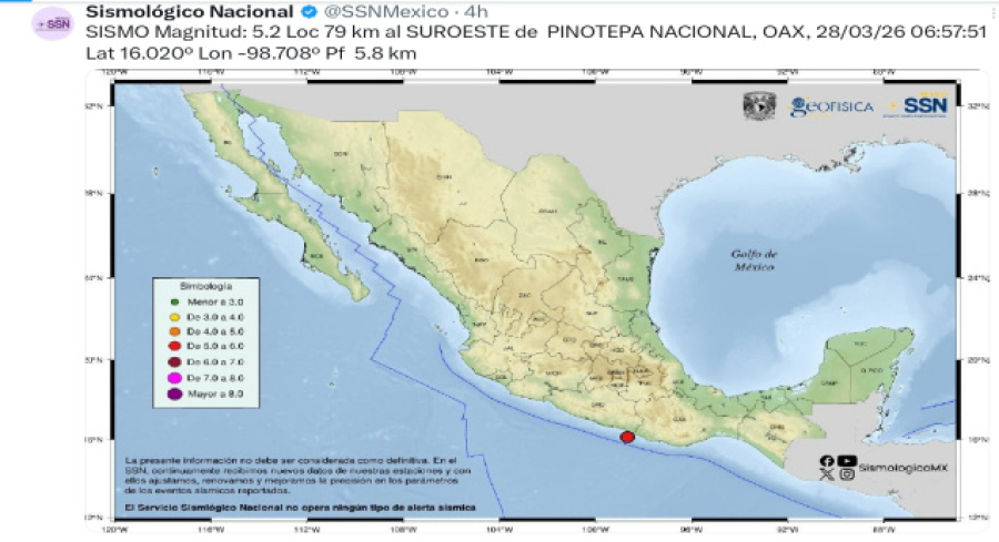 Oaxaca, México. 28 de marzo de 2026.– La Coordinación Estatal de Protección Civil y Gestión de Riesgos (CEPCyGR) informa a la población que se ha registrado un enjambre sísmico en Santiago Pinotepa Nacional y sus alrededores, sin que hasta el momento se reporten daños materiales ni personas lesionadas.