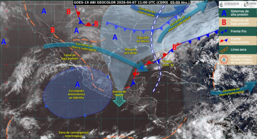 Estas condiciones son ocasionadas por el frente frío número 43, el cual permanece casi estacionario sobre la Península de Yucatán, en interacción con un canal de baja presión.