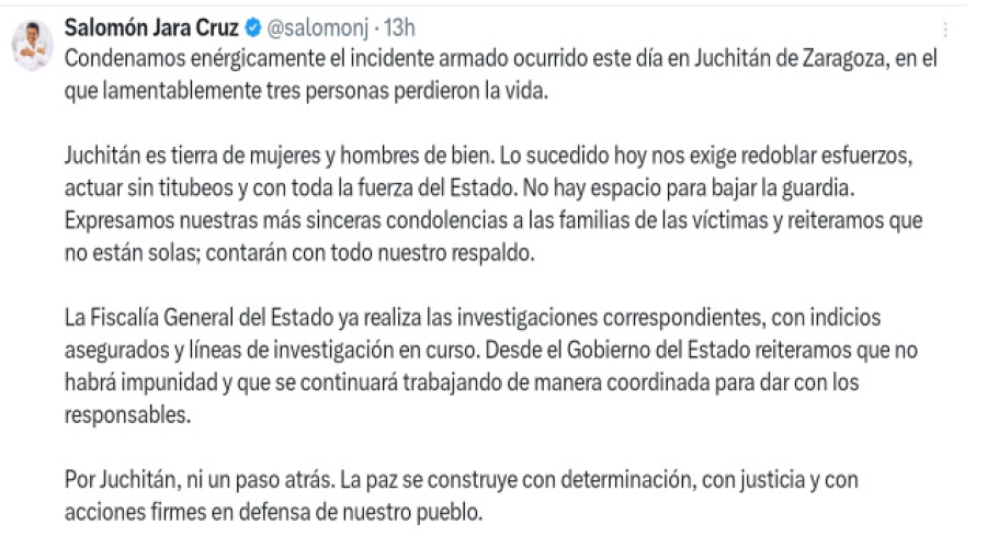 Oaxaca, México. 19 de abril de 2026.- El gobernador de Oaxaca, Salomón Jara Cruz, condenó los hechos violentos ocurridos en Juchitán de Zaragoza, donde tres personas perdieron la vida.